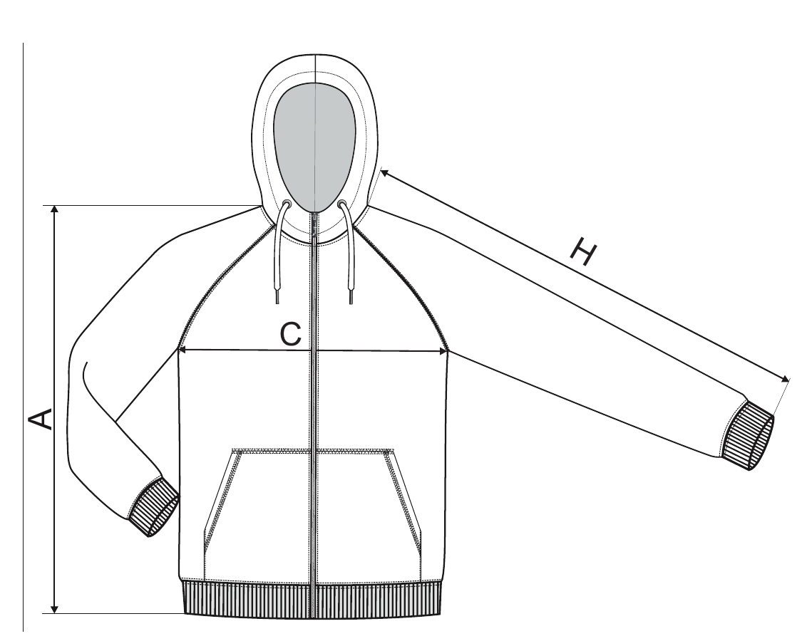 egyenes szabás oldalvarrással, fémcipzár teljes hosszban, cipzár húzóka gravírozott logóval, zsinórral összehúzható, bélelt kapucni, belső nyakrész szegéllyel, raglán ujjak díszítő varrással, rávarrt kenguru zsebek, 2:2 bordás kötésű szegély és mandzsetták 5 % elasztánnal, kontraszt elemek, hurkolt belső oldal